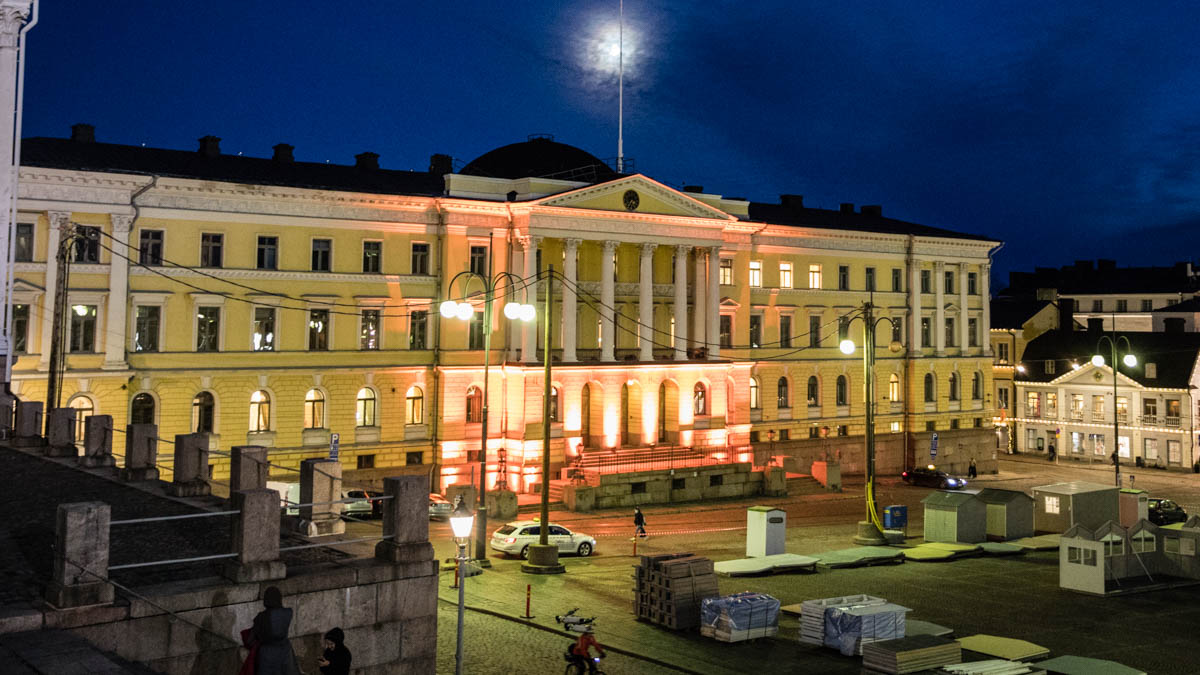 Valtioneuvoston linnan valaisu oranssiksi alkaa tiistaina 24.11. klo 18 ja päättyy torstaiaamuna 26.11. klo 9.