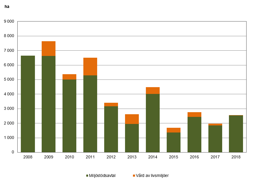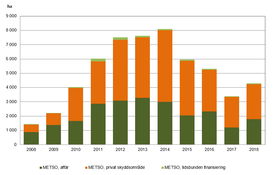 År 2018 ingicks sammanlagt 835 tidsbundna miljöstödsavtal inom ramen för lagen om finansiering av hållbart skogsbruk, och den sammanlagda arealen – 2 541 hektar – överskred det mål som ställts för året med omkring fem procent. Miljöstödsobjekten hade i genomsnitt en areal på tre hektar, och hälften av objekten var skogar kring småvatten. Största delen av skyddsavtalen gällde moskogar som är betydande med tanke på mångfalden, och naturvårdsarbeten utfördes i synnerhet i lundskogar och i solexponerade livsmiljöer. Dessutom genomfördes enligt en ny modell även ett hyggesbränningsprojekt som främjar den biologiska mångfalden, och flera motsvarade projekt kommer att genomföras de närmaste åren.