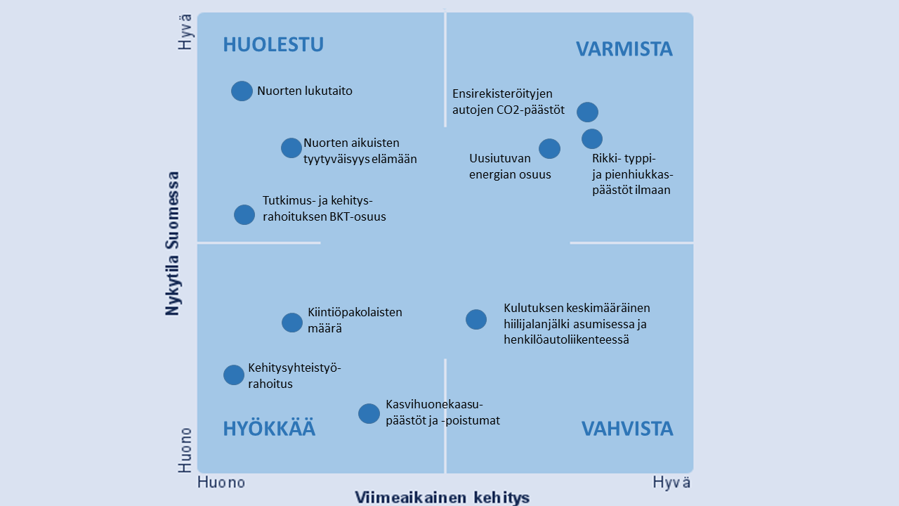 Pääsihteeristö on arvioinut Suomen tilannetta ja viimeaikaista kehitystä käyttäen apunaan kuvassa olevaa nelikenttää ”varmista–huolestu–hyökkää–vahvista”.