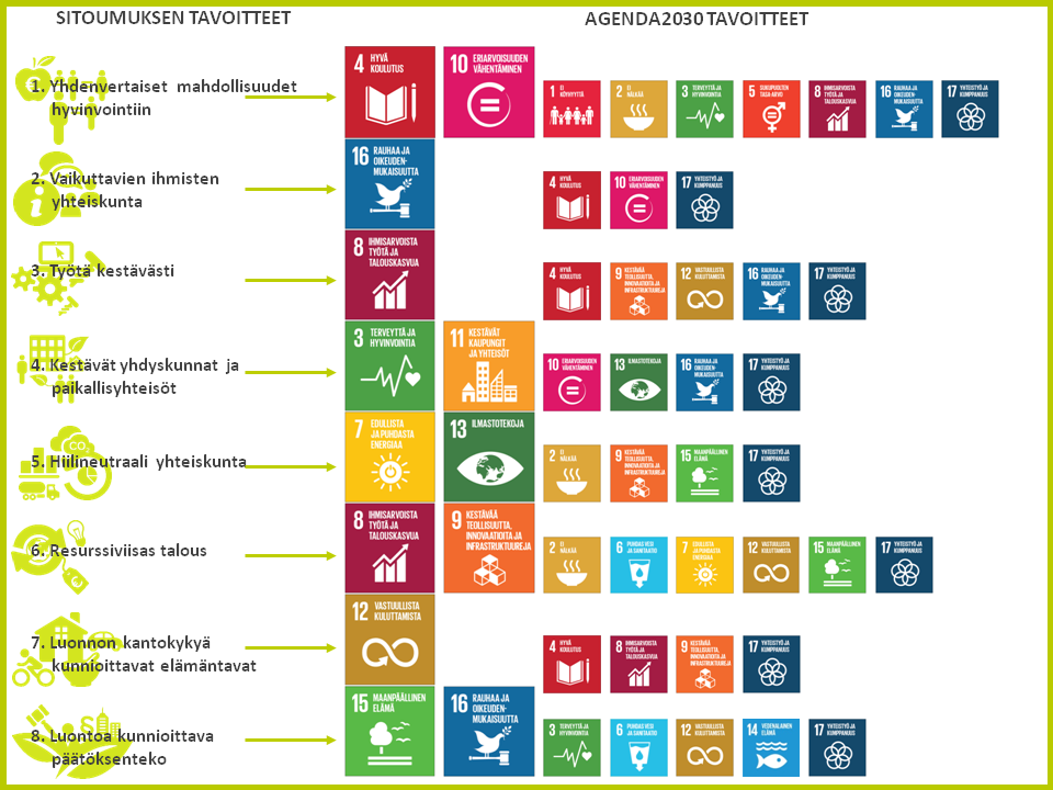 Päivityksen myötä Suomen kestävän kehityksen linjaus eli kestävän kehityksen yhteiskuntasitoumus on varsin hyvin linjassa YK:n kestävän kehityksen toimintaohjelma Agenda2030:n kanssa. Sitoumuksen kahdeksan tavoitetta sisältävät kattavasti kaikki Agenda2030:n 17 päätavoitetta.