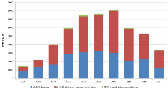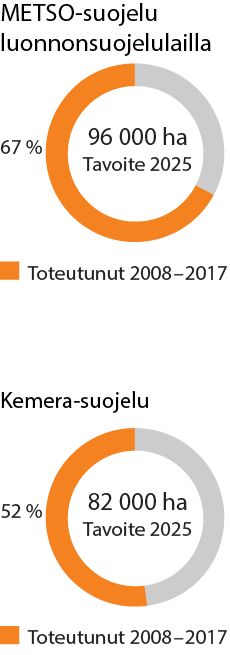 Metsien monimuotoisuutta turvaavan METSO-ohjelman kautta suojeltiin vuonna 2017 yhteensä yli 5 000 hehtaaria metsää joko pysyvästi tai määräaikaisilla sopimuksilla. Lisäksi luonnonhoitotöitä toteutettiin METSO-elinympäristöissä 111 hehtaarilla. 10 vuotta sitten käynnistynyt METSO on nyt saavuttanut noin 60 % vuodelle 2025 asetetusta suojelutavoitteestaan.