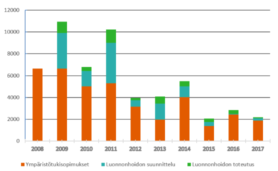 Vuonna 2017 Kemeran puitteissa tehtiin 617 määräaikaista ympäristötukisopimusta, yhteensä 1 855 hehtaarille, mikä vastaa 90 % vuoden tavoitteesta. Ympäristötukikohteet olivat pinta-alaltaan keskimäärin 3 hehtaaria, ja kohteista puolet oli pienvesien lähimetsiä. METSO-elinympäristöistä suojelusopimuksia solmittiin eniten monimuotoisuudelle merkittävistä kangasmetsistä. Merkittävimpiä luonnonhoitotöitä olivat lehtojen hoito, pienvesien ja etenkin purojen kunnostaminen, soiden vesitalouden ennallistamistyöt sekä paahde-elinympäristöjen hoitotyöt.