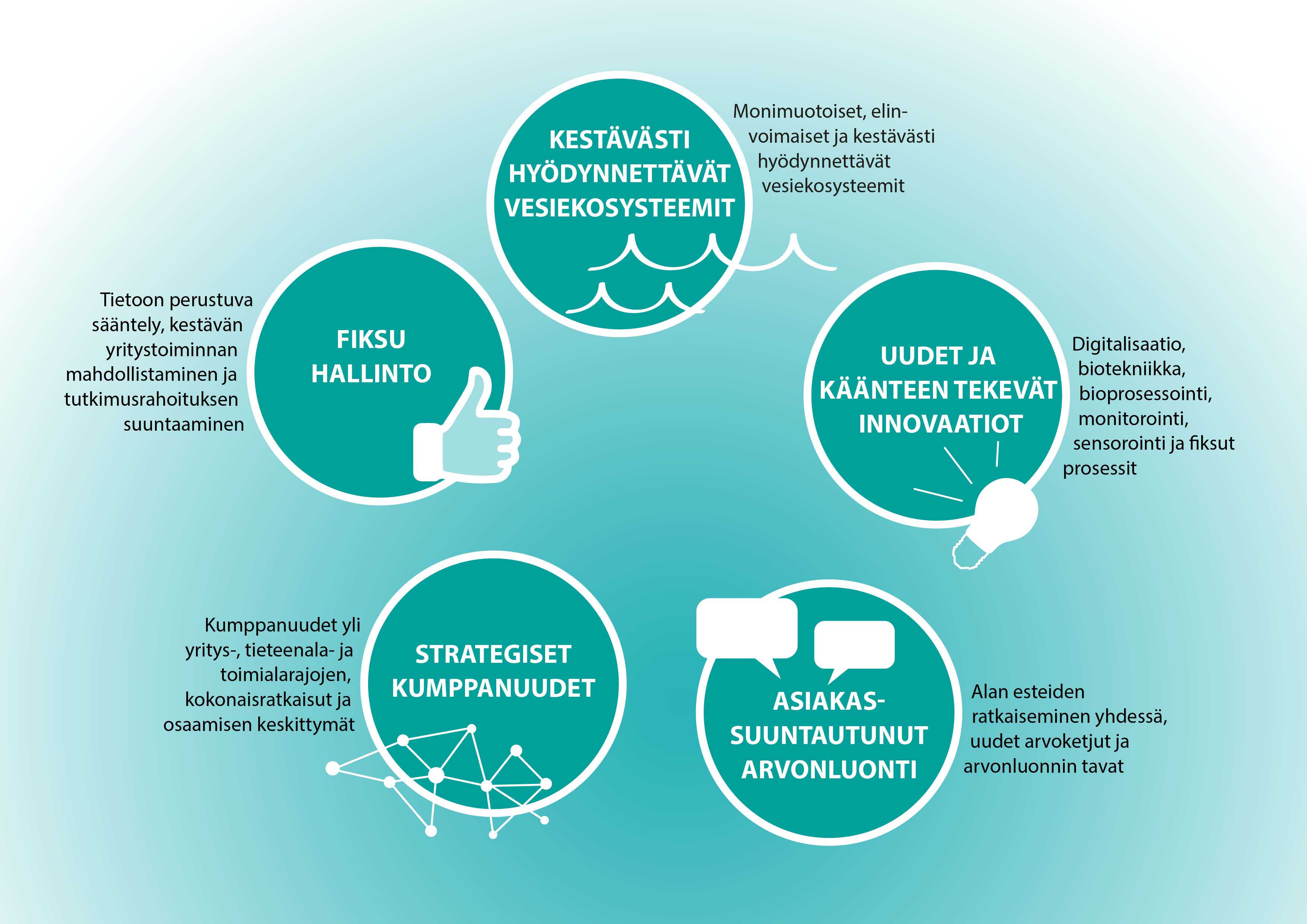 Innovaatiot mahdollistavat uudenlaiset resurssikierrot sekä täysin uudenlaiset veden ja vesiluonnonvarojen hoidon ja käytön ratkaisut. Innovaatioiden syntymiselle on tärkeää luoda edellytyksiä. Digitalisaatio sekä bioteknologian ja –prosessoinnin nopeasti kehittyvät menetelmät mahdollistavat korkean arvon tuotteiden ja uusien palveluiden kehittämisen.