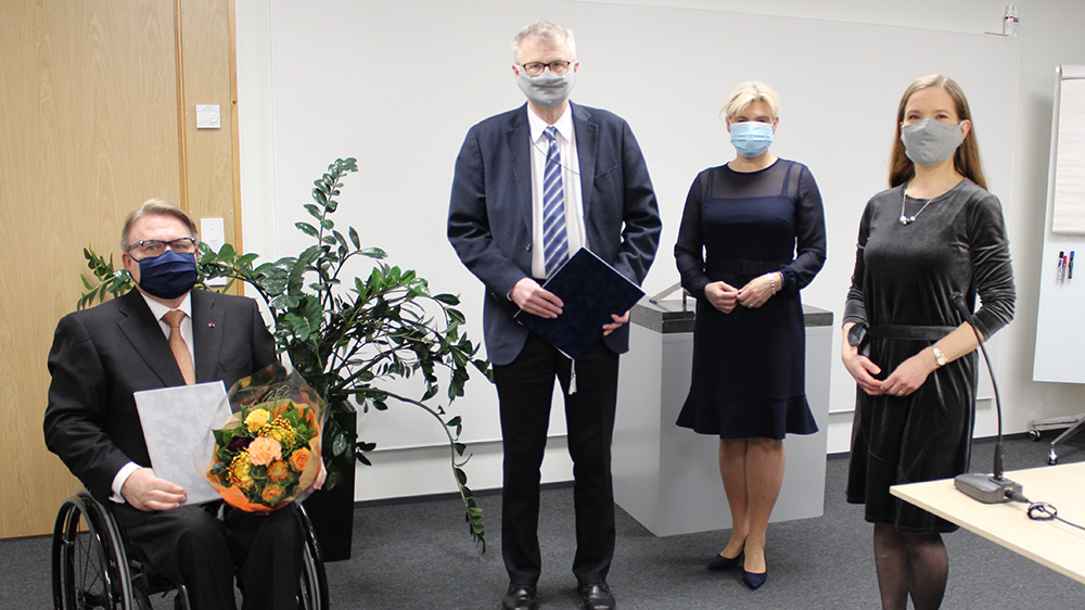 Kuvassa (vas) pääjohtaja Petri Pohjonen, ylijohtaja Esko Ranto, johtaja Tiina Kivisaari ja kulttuuriasiainneuvos Päivi Aalto-Nevalainen. Kuva: Noora Moilanen
