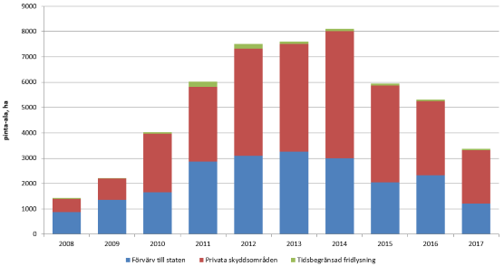 Åren 2008–2017 har man med METSO-finansiering inrättat nya skyddsområden på mark som ägs av enskilda, kommuner, församlingar och bolag samt förvärvat områden till staten för naturskyddsändamål. Den sammanlagda arealen på dessa områden uppgår till ca 51 540 hektar. Om man räknar in Forststyrelsens markområden på 13 000 hektar, som genom statsrådets principbeslut om handlingsplanen överfördes för naturskyddsändamål 2014, uppgår den totala arealen för de METSO-objekt som skyddats inom miljöministeriets förvaltningsområde till ca 64 540 hektar. Detta utgör 67 procent av miljöministeriets skyddsmål på 96 000 hektar fram till 2025. För att målet ska nås bör i genomsnitt 3 900 hektar skyddas årligen ända fram till slutet av programperioden.