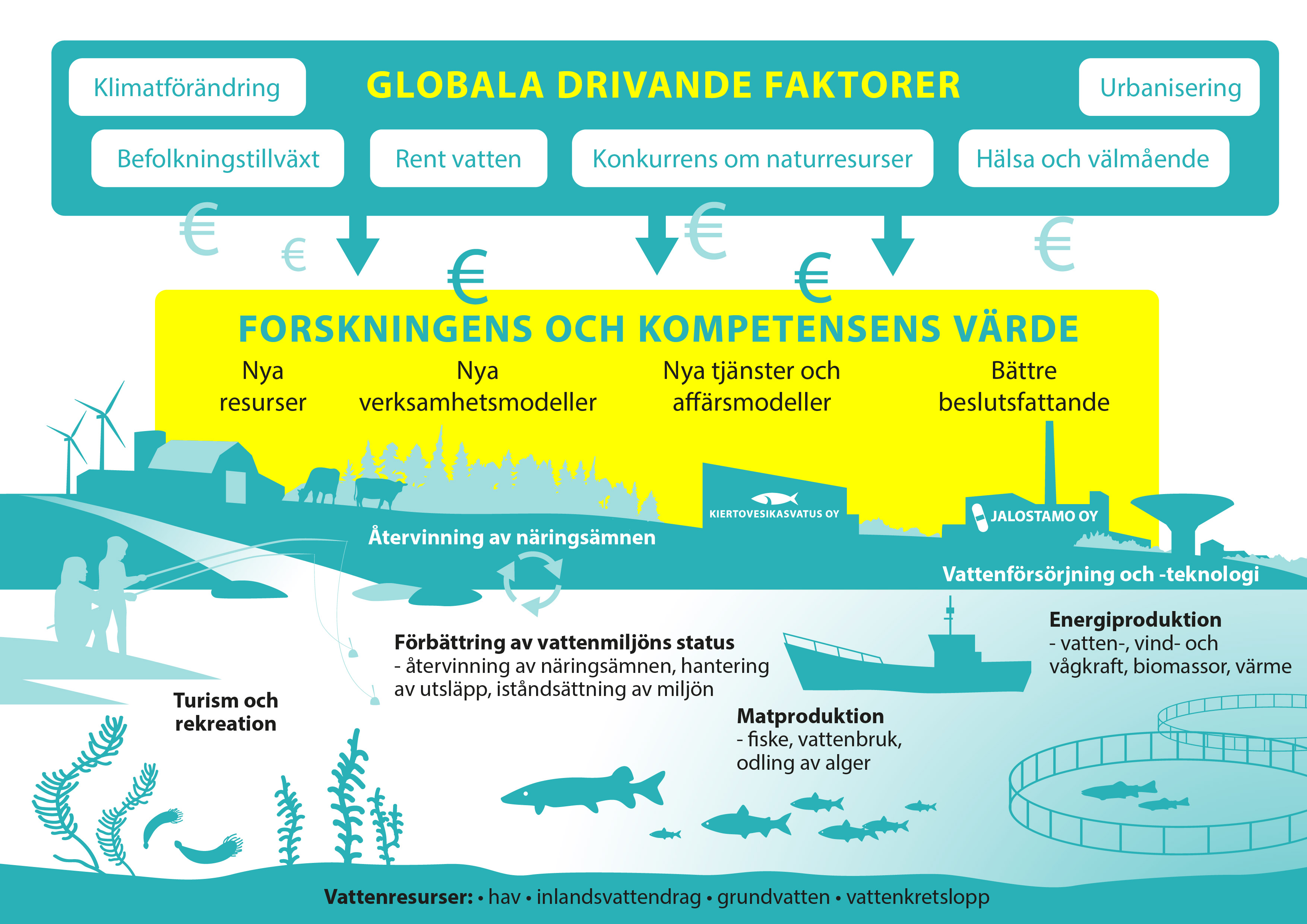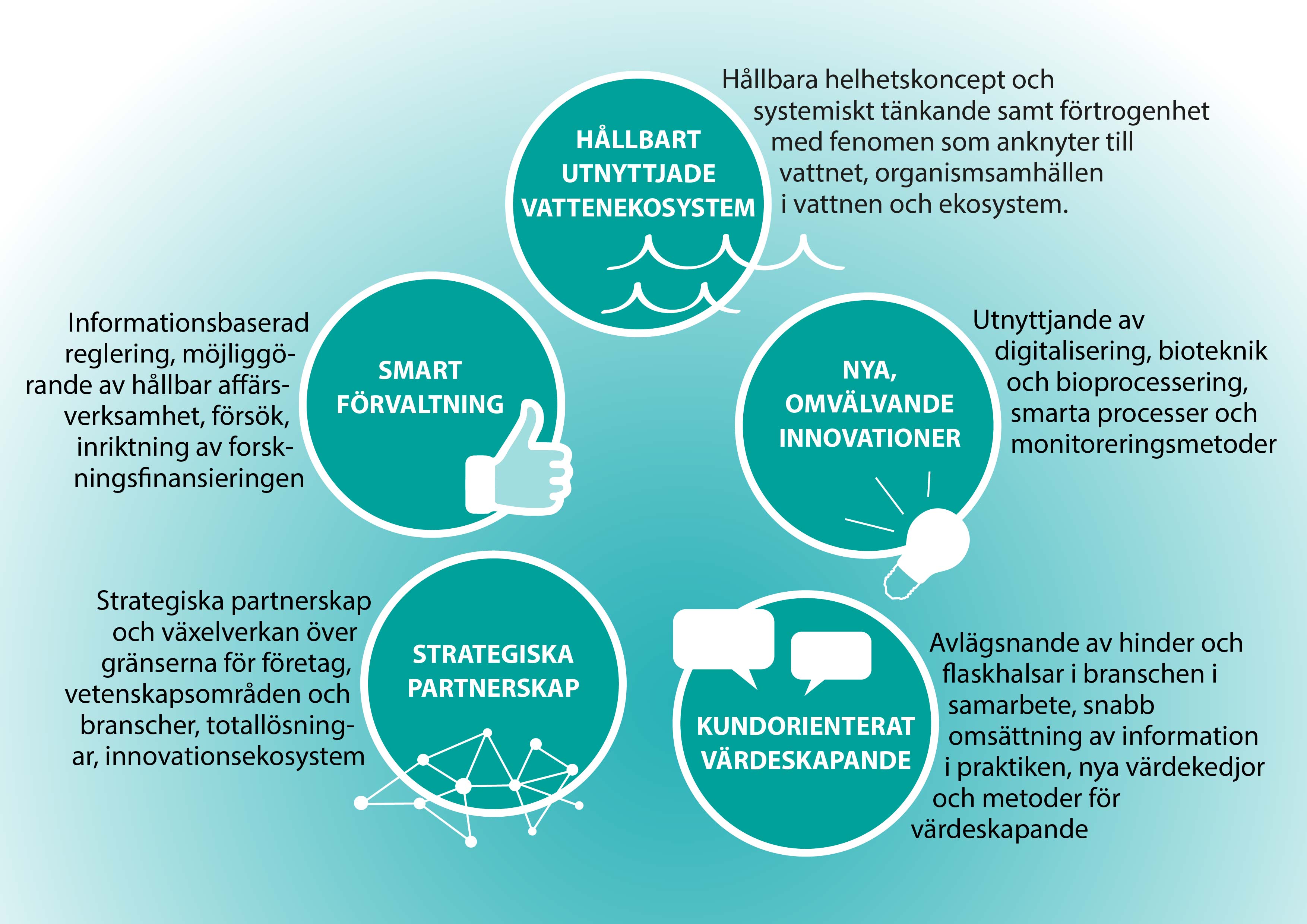 Innovationer möjliggör nya resurskretslopp samt helt nya lösningar för att förvalta och använda vatten och akvatiska naturresurser. Det är viktigt att vi skapar förutsättningar för nya innovationer. Digitaliseringen och metoderna inom bioteknologi och -processering, som utvecklas snabbt, gör det möjligt att utveckla högvärdesprodukter och nya tjänster.